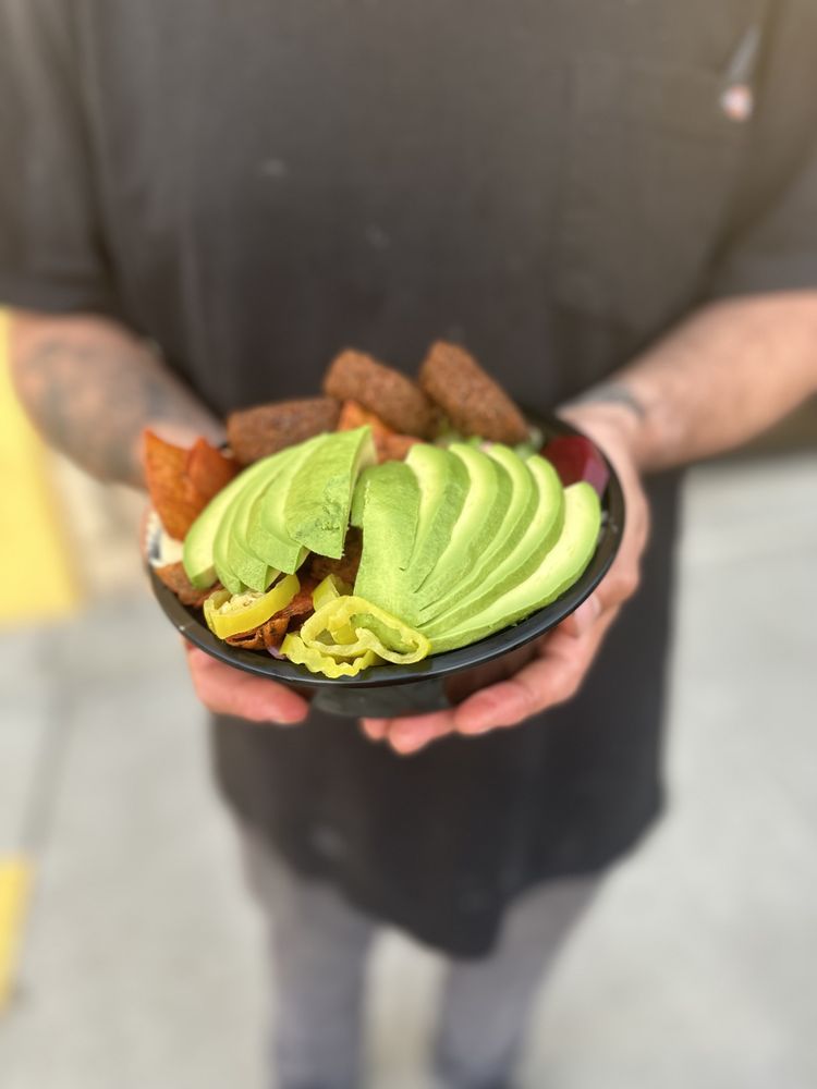 Kareem's falafel, salad, rice, avocado, turnips, hummus, pickles, pita croutons. Served with pita.